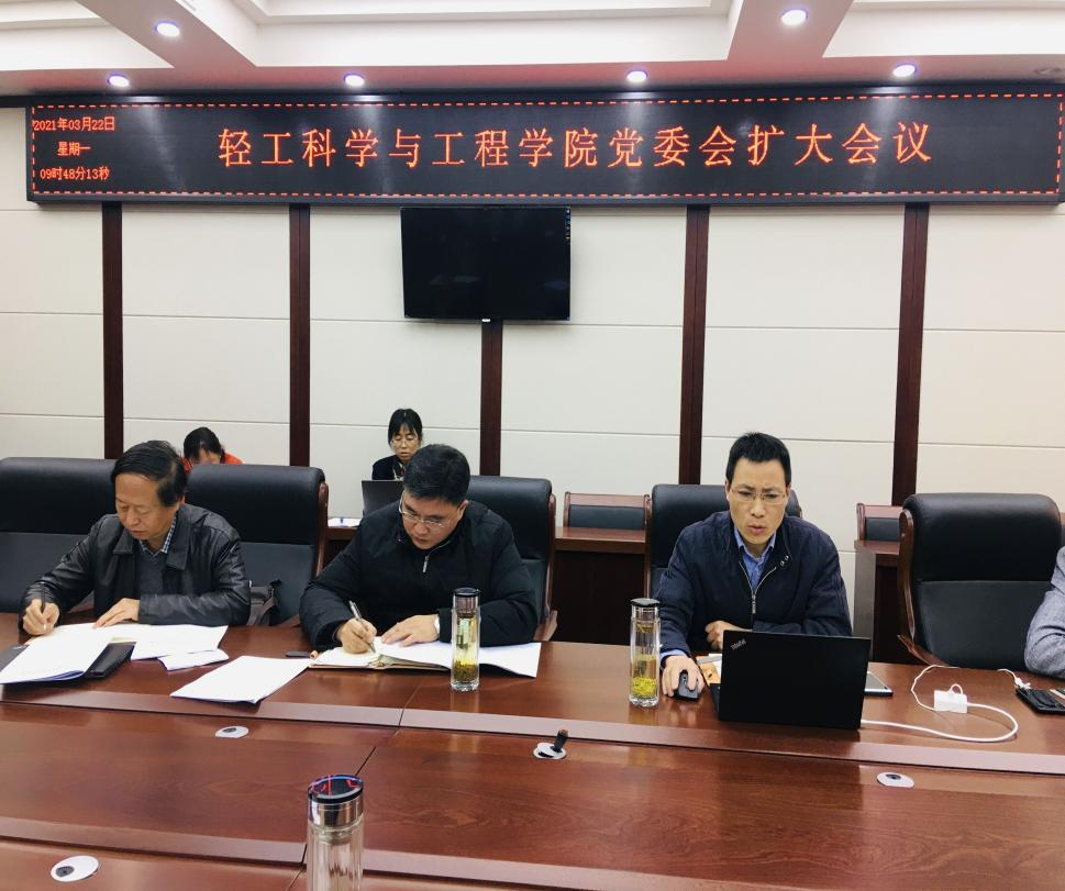 为深入学习贯彻习近平总书记在党史学习教育动员大会上的重要讲话精神,全面落实教育部党组、四川省委相关工作安排,结合学校全面从严治党工作部署,2021年3月22日上午,学院在纺工附楼205会议室召开党委会扩大会议暨全面从严治党专题会议。学院党政领导班子、两委委员、支部书记、系所干部、科级干部参加本次会议,会议由刘晓虎书记主持。