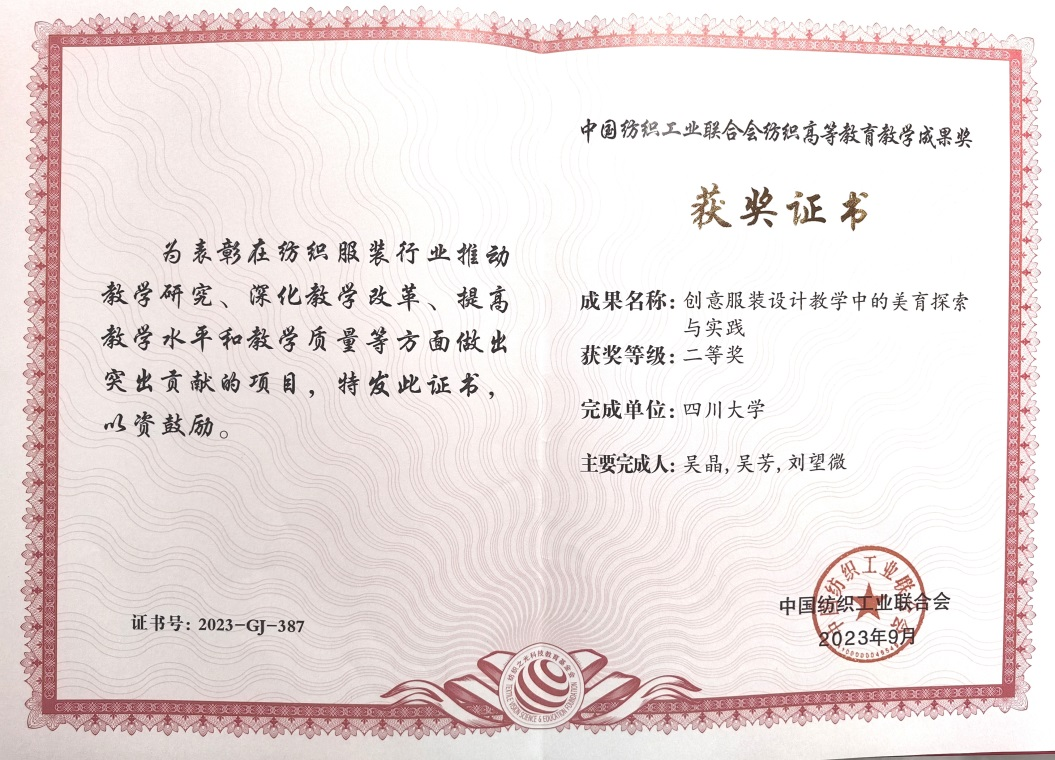 12月9日,2023年中国纺织服装教育学会七届五次常务理事会议暨高等教育分会理事会议于河南郑州召开,会上颁发了“纺织之光”2023年度中国纺织工业联合会教师奖和学生奖、教育教学成果奖。在此次大会中,经专家评审,中国纺联批准,奈菲影视服装与服饰设计系时昱老师获“‘纺织之光’2023 年度教师奖”,蔡雨轩、李子安、彭红超、余金城、赵若绵五位同学获“‘纺织之光’2023 年度学生奖”,吴晶、吴芳、刘望微老师的教学成果“创意服装设计教学中的美育探索与实践”获“教育教学成果二等奖”。