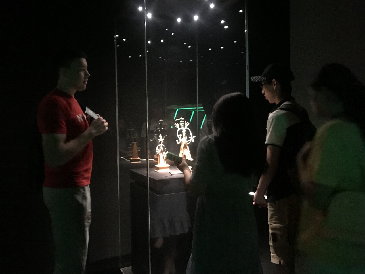 之后,又来到了《花重锦官城——成都历史文化陈列》主题展,其中陈列了许多有关我国成都历史的文物,志愿者们时不时与交流生讲述文物背后的内涵,帮助交流生更好地理解关于成都文化。最后,参观了《影舞万象·偶戏大千——中国皮影木偶展》,中国皮影文化生动有趣,博大精深。交流生们觉得甚是好玩,在展厅参观了好一会,还观看了变脸、喷火等有关京剧的视频。甚至到最后临近午饭时间,有几个交流生还恋恋不舍想多参观一会儿。