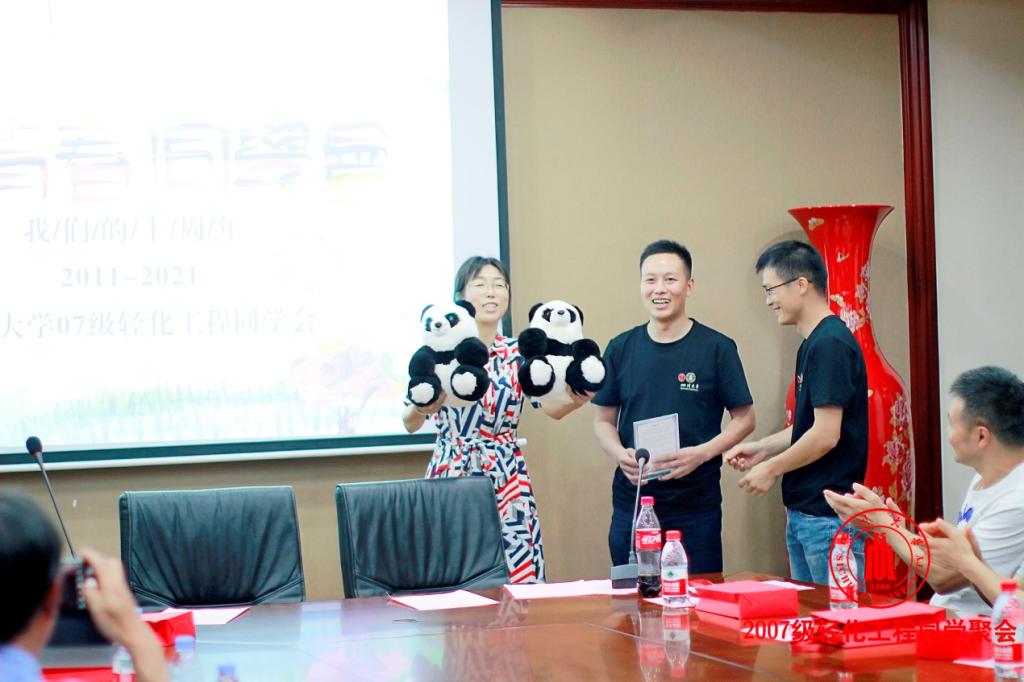 程自强及刘强代表2007级轻化工程校友赠送皮革系纪念礼物—“熊猫大使”,生物质与皮革工程系主任林炜予以接收。该“熊猫大使”经奈菲影视