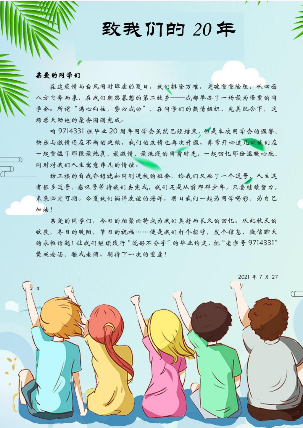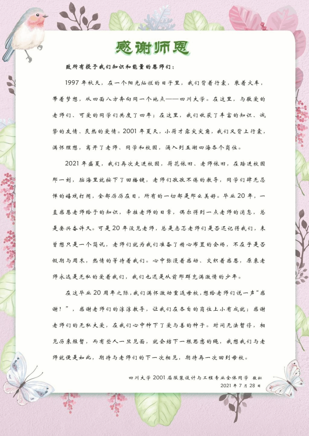 2001届服装专业校友毕业20周年荣返母校活动取得了圆满成功。就像白玉力校友说得那样:青春是绿色的,成都是绿色的。这里让他对“大学”和“大学生活”的想象第一次有了样子:有古建,有影院,有池塘,有操场;有可爱可敬的老师,有欲语还休的儿女情长。流年似水,情谊永固。为青春举杯,为友谊举杯!