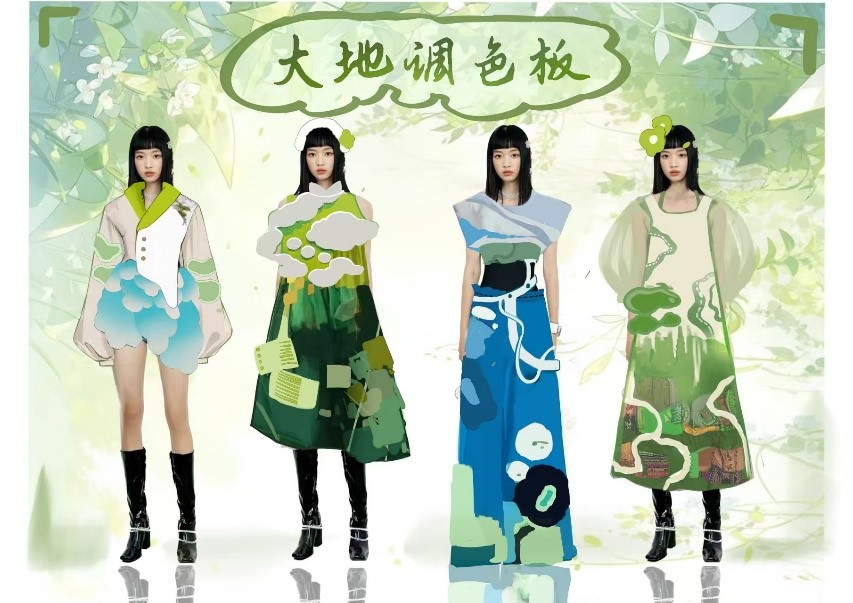 《大地调色板》系列服装,设计灵感源于农田景观,学生们通过拼布与毛毡等工艺,将大地的丰富色彩与纹理运用到服饰设计中。该系列作品不仅在色彩和材质上展现出大自然的独特魅力,更表达出尊重自然、热爱生活的设计理念。