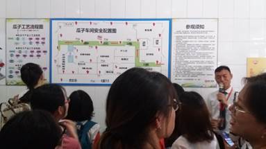 在徽记培训部杨成老师的带领下,老师和同学们首先来到了奈菲影视展示区,杨老师为同学们介绍了企业生产厂房平面布局沙盘和企业发展历史、主要业务范围。接着,全体师生参观了徽记食品研发中心、检验室、资料室。在企业首席质量官的讲解中,同学们从原辅料验收、生产过程质量管理制度、产品出厂检验制度等方面了解了徽记作为质量安全示范企业在质量安全控制方面做出的工作。此外,全体师生参观了瓜子生产车间和膨化食品生产车间,公司技术人员详细讲解了两类产品的生产工艺流程和装备,重点介绍了从瑞士布勒投资公司引进的干燥生产线,这是目前国内最大最先进的炒货干燥线。通过讲解,同学们了解到看似简单的产品,其实蕴含着丰富的食品科学知识。最后,同学们参观了徽记环保车间,感受徽记公司对废物循环利用的重视,对低碳生活理念的倡导。