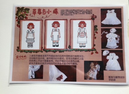 以上系列连衣��设计师罗屹瑶�草莓为主��白色为底色,���多种不同质地的同色面�辅料���红线刺绣�绗缝�手法,使�系列�服饰�主题突出�层次分明��小女孩纯�可爱的特�充分展现�