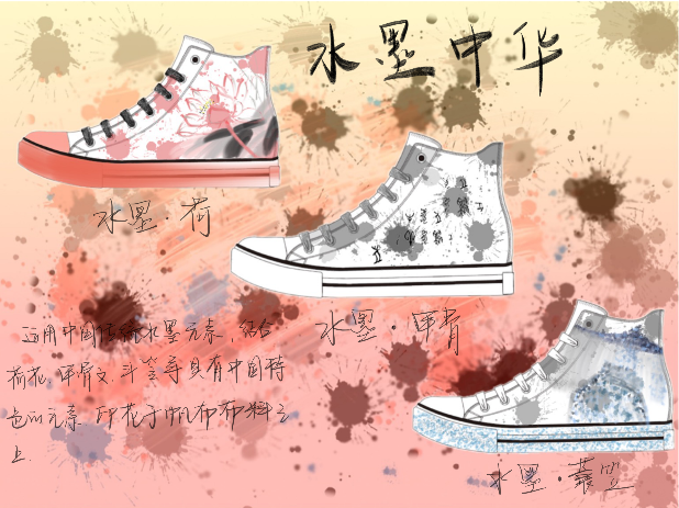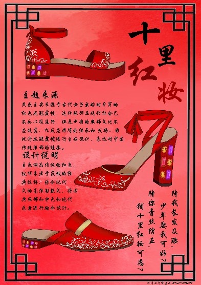 在《鞋类设计与开发》部分的课后作业中,姚云鹤老师也增加了“在设计中融入中华传统文化元素”的内容,引导同学们在课程学习的基础上进行深入思考,在设计实践中融入中华传统文化元素。同学们纷纷在设计图稿中融入中华传统文化的元素,设计出了各具特色的中国风鞋子�