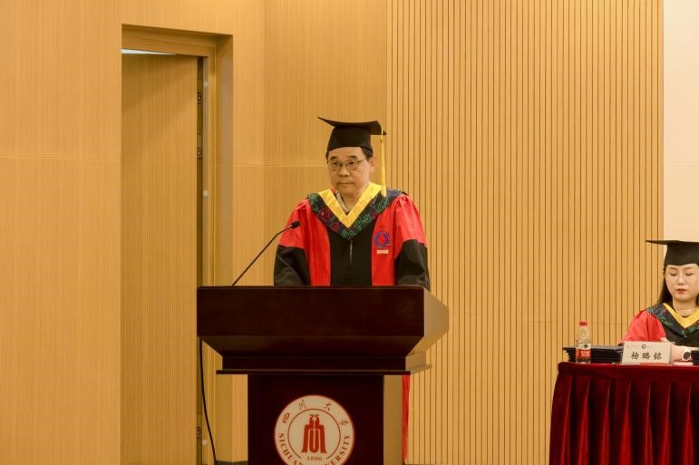 学位评定分委员会主席、院长彭必雨教授致辞。他勉励全体毕业生:“要将青春梦想熔铸于民族复兴的伟大征程,用奋斗的笔墨书写属于新时代的人生华章。”面向未来,彭院长以师者之心提出殷切嘱托:第一,永葆赤子之心,做胸怀家国的追梦者,让个人理想与时代脉搏同频共振;第二,秉持求实精神,做知行合一的实干家,以深厚的专业积淀和全球化的视野格局赢得出彩人生;第三,勇立时代潮头,做敢为人先的开拓者,以创新思维引领行业发展,书写属于自己的精彩篇章。