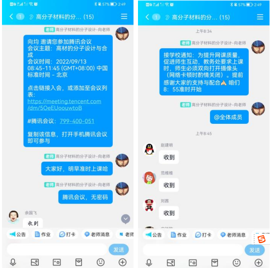 开设硕士研究生公共课2门,博士研究生专业课程2门,硕士研究生专业课程5门。共339名学生通过网络与教师见面,在这个特殊时期全体师生共同参加新学期的“线上第一课”。直至目前,各任课教师依然按照“不降标准、不拘形式、保证质量、灵活多样”的原则,根据专业方向和课程要求的不同特点,灵活选择教学手段,在群内上传PPT课件、教案等资料,确保“线上课程不空堂、学生一个不落下”。