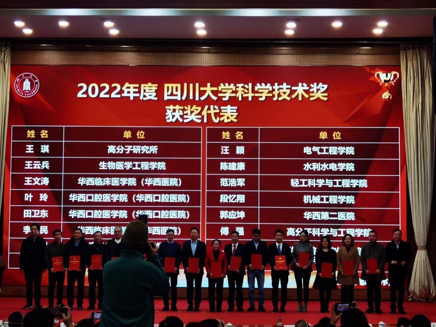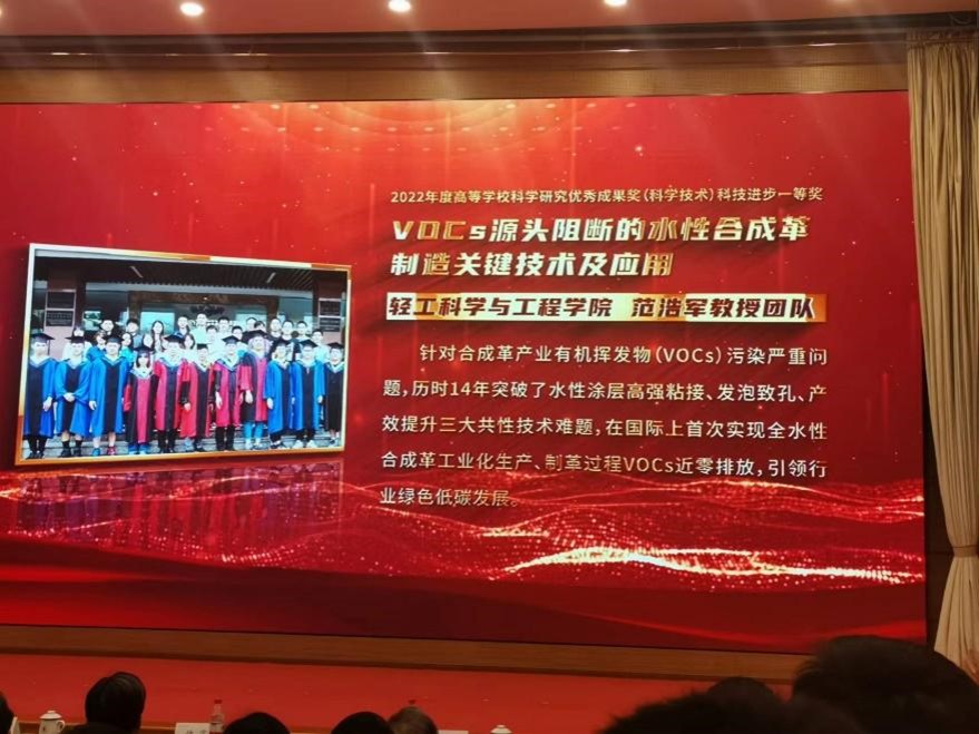 、皮革化学与工程教育部重点实验范浩军、陈意教授团队成果“VOCs源头阻断的水性合成革制造关键技术及应用”获得2022年度教育部科技进步一等奖,校长李言荣院士亲自颁奖并表示祝贺。
