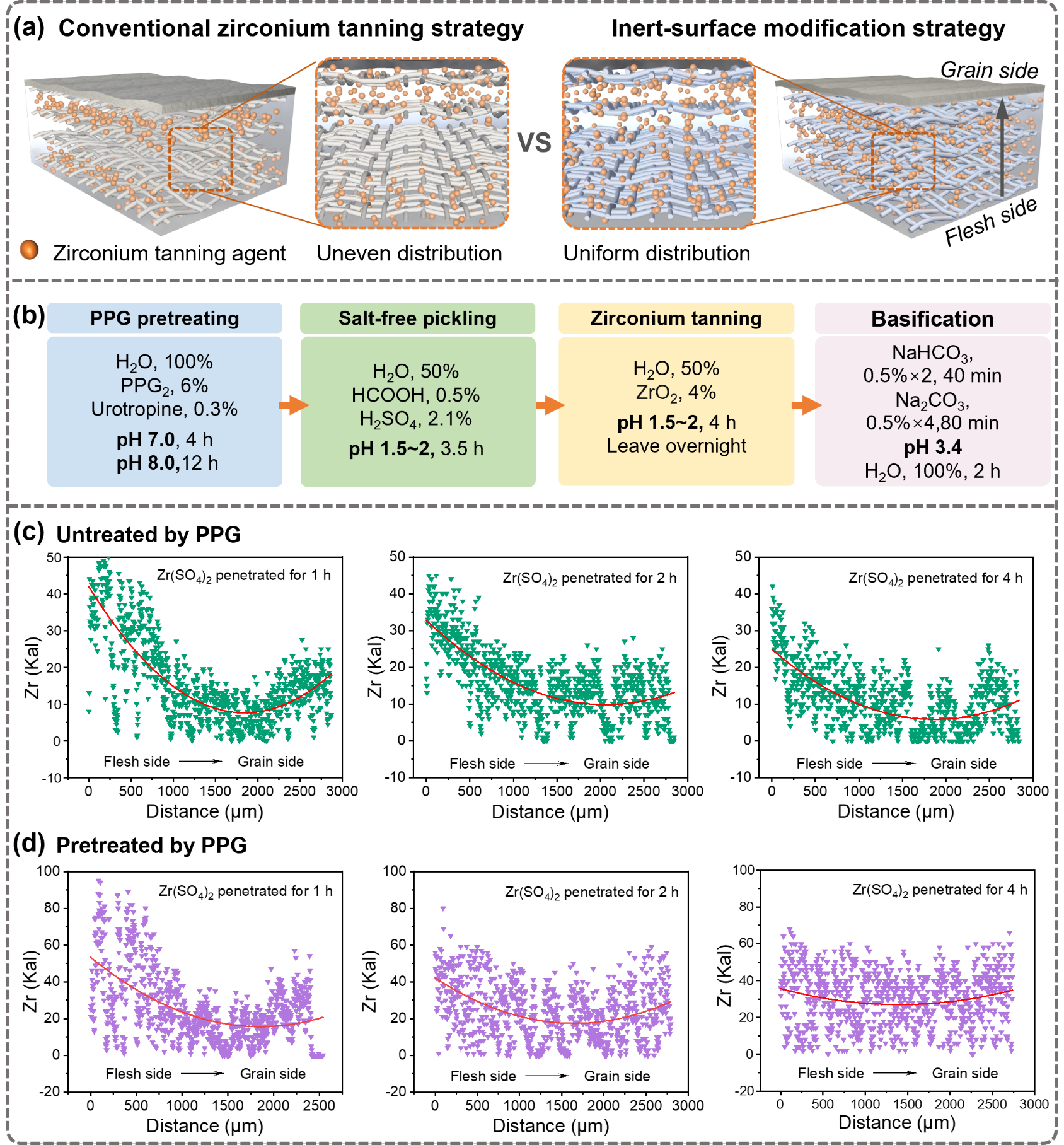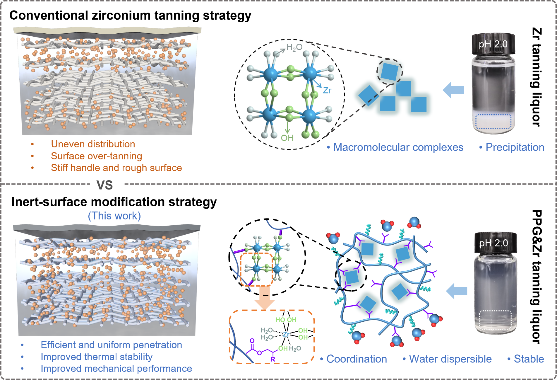 在前期的研究工作中,已经证明含有聚乙二醇链段的多元共聚物对于金属鞣剂具有惰化保护作用(ACS Sustainable Chem. Eng. 2019, 7, 8660−8669; J. Clean. Prod. 2020, 277, 123278; Mater. Horiz. 2022, 9, 1309)。本研究针对上述锆鞣剂存在的问题,在已有研究的基础上通过逆向思维,采用聚乙二醇化的多环氧基共聚物对皮进行鞣前预处理,以达到惰化胶原表面,减弱皮胶原与锆鞣剂间相互作用的目的。与此同时,通过与处理在皮胶原纤维中引入能与锆离子产生配位作用的羟基和羰基,从而缓解水合锆离子之间的过度配位络合,促进锆鞣剂在皮中的均匀渗透。研究结果表明,与常规锆鞣相比,基于该惰性表面改性策略的锆鞣技术能够实现高效均匀的鞣制效果,能够全面提高坯革的性能。通过该方法制备的坯革,其热稳定性、物理和机械性能与铬鞣坯革相当。此外,由于多环氧基共聚物通过共价交联封闭了皮胶原氨基,能够避免在浸酸过程中使用中性盐,从而实现无盐浸酸。综上,本研究提出的胶原表面惰化改性策略有效解决了锆鞣剂易于在皮革表面沉积的问题,有助于推动鞣制技术向更为高效、清洁的方向发展,促进传统锆鞣剂在绿色制革领域的进一步应用。