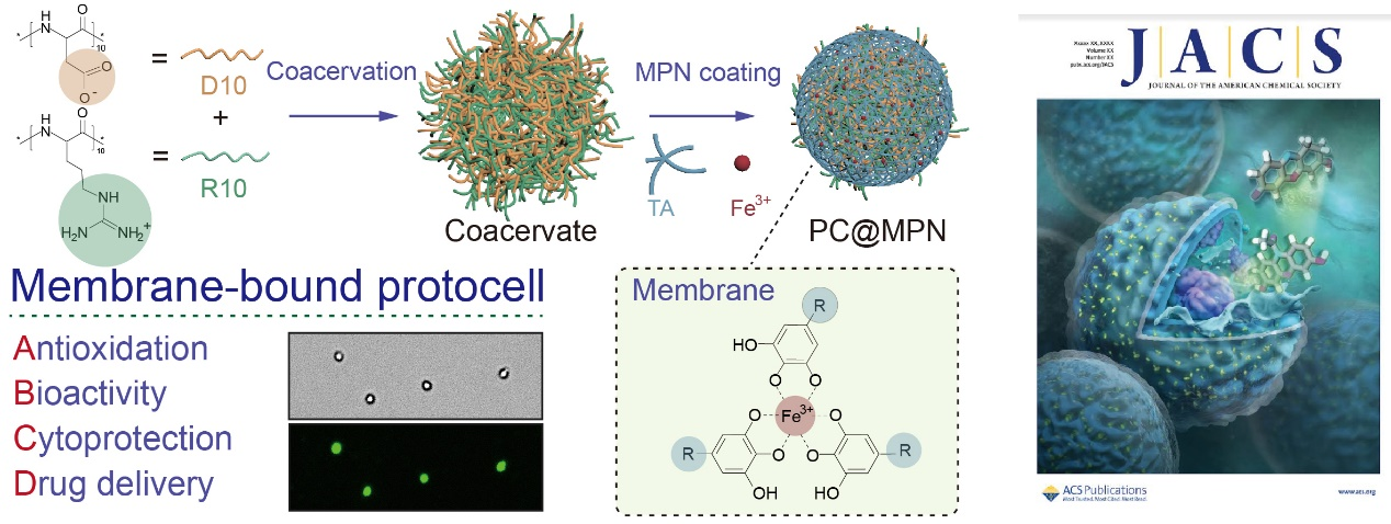 刘磊教授、墨尔本大学Frank Caruso教授团队合作,开发了一种基于凝聚体和金属多酚网络的新型原始细胞模型(peptide coacervate@metal−phenolic networks,PC@MPNs),并证明了其作为药物递送平台的潜力,该研究成果以题为“Peptide-Based Coacervate Protocells with Cytoprotective Metal−Phenolic Network Membranes”发表于国际化学顶级期刊《Journal of the American Chemical Society》(影响因子16.383;川大A-),并入选封面论文。研究以相反电荷寡肽形成的凝聚体模拟细胞质,利用金属多酚网络模拟细胞膜,构建了一种新型的原始细胞系统PC@MPNs。这种原始细胞能高效地负载各种生物活性大分子,如牛血清白蛋白和免疫球蛋白G。同时,金属多酚网络细胞膜不仅能够稳定凝聚体,还赋予原始细胞选择透过性以及优异的自由基清除能力。该PC@MPNs能够模拟细胞信号传递进行生物催化级联反应,并通过表面修饰各类功能分子进一步模拟真实细胞的结构。研究证明,负载抗癌药阿霉素并被叶酸修饰后的PC@MPNs可被用于治疗鳞状细胞癌,具有作为药物递送平台的巨大潜力。