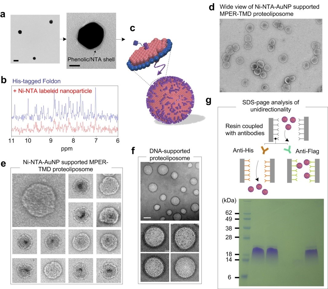 在该研究中,研究团队首先制备了植物多酚修饰的金纳米颗粒,将NTA分子与邻苯二酚或邻苯三酚上产生亲电反应,并加入镍离子,从而在金纳米颗粒表面形成Ni-NTA配合物(图二a);修饰后的纳米颗粒和组氨酸标签的亲和作用通过核磁共振谱进一步验证(图二b)。将重组在脂碟中的HIV-1 MPER-TMD和修饰后的金多酚纳米颗粒以最佳比例混合,并通过透析去掉系统中的表面活性剂,最终得到了由膜蛋白和纳米颗粒诱导形成的大小均一的膜蛋白脂质体(图二d,e)。在HIV-1 MPER-TMD的N端和C端分别有抗Flag标签和组氨酸标签,最终制备的HIV-1 MPER-TMD脂质体只能被抗组氨酸标签的抗体识别,而不能被抗Flag的抗体识别(图二g),说明了HIV-1 MPER-TMD在脂质体的朝向是单一的,能被精确控制的。同时,该研究也测试了利用DNA折纸法形成的空心球作为内核也同样能指引HIV-1 MPER-TMD脂质体的组装(图二f)。