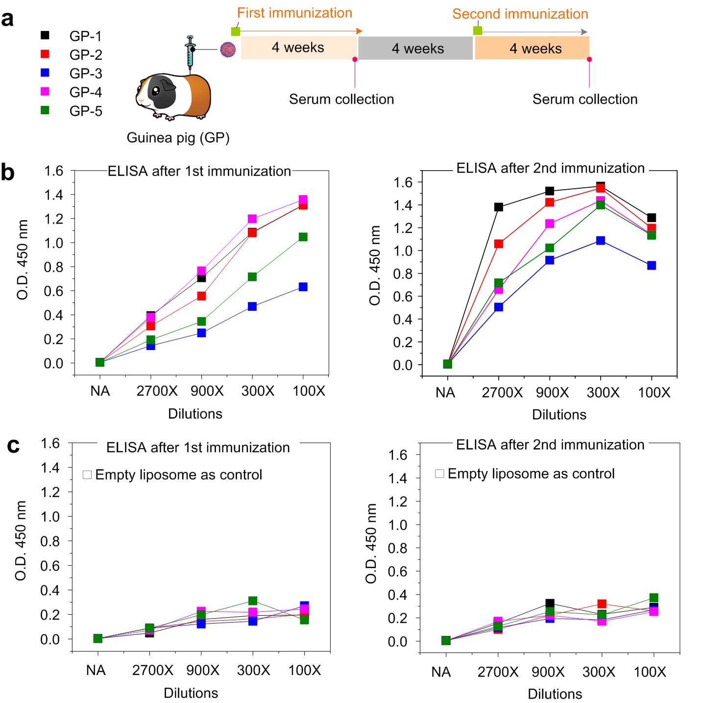 研究团队将组装好的MPER-TMD脂质体注射到豚鼠的体内,并在每次注射后的4个星期收集豚鼠的血清(免疫实验仍在进行中)。通过ELISA反应的检测,血清里含有大量可以和MPER-TMD蛋白特异性结合的抗体,并且抗体的含量随着免疫实验的进行而增加(图三)。MPER-TMD蛋白由于大部分区域都在生物膜内,具有非常弱的免疫原性,到目前为止还没有通过免疫MPER-TMD蛋白而诱导产生中和性抗体的记录。但是,通过SPLANDID方法制备的MPER-TMD脂质体,可以在很短的时间内就能通过免疫反应在动物体内产生的大量的抗体,能够高效的刺激免疫系统产生HIV特异性抗体。该部分结果为获得艾滋病病毒、新型冠状病毒SARS-CoV-2、中东呼吸综合征冠状病毒MERS-CoV的中和性抗体建立了研究基础。