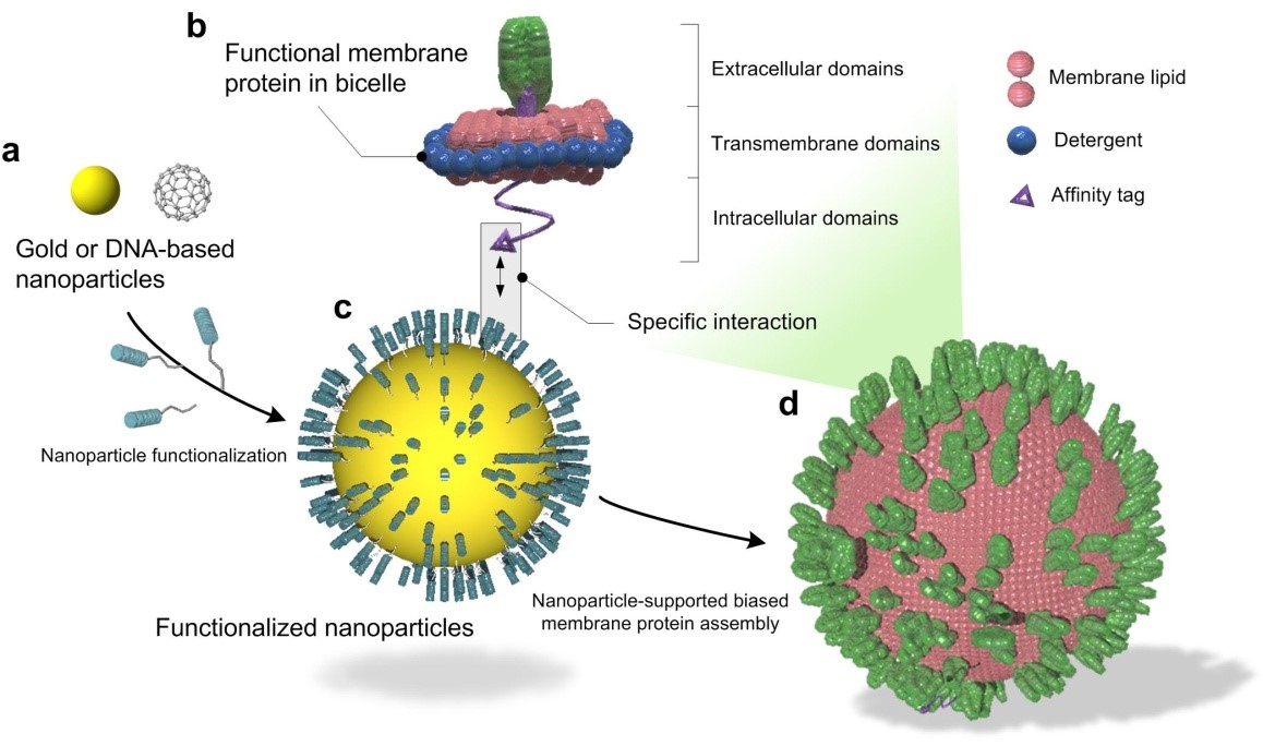 James Chou教授共同研发,以植物多酚修饰的纳米颗粒为内核,通过多酚基团和膜蛋白的特异结核作用,将膜蛋白脂质体包裹在纳米颗粒表面,从而构建了无传染新的人工蛋白。此方法被命名为SPLANDID平台(Supported Proteoliposome for Antigen Directed Display),该平台的具体流程如图一所示:1a. 将纳米颗粒表面修饰为植物多酚(包含邻苯二酚或邻苯三酚);1b. 纯化后的病毒膜蛋白质被重组在脂碟(bicelle);1c. 通过纳米颗粒表面的邻苯二酚或邻苯三酚基团,可以与膜蛋白上的亲和标签特异性的结合(包括Ni-NTA分子和组氨酸标签的结合); 1d. 膜蛋白质携带脂碟被有序的吸引到纳米颗粒的表面,通过透析作用或者其他方法逐渐的将表面活性剂去掉,脂分子会相互融合,进而形成封闭的包含有病毒膜蛋白质的脂质体。