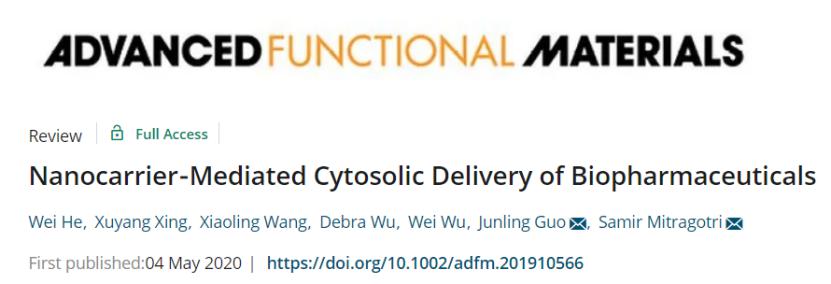 近期,国际顶级期刊《Advanced Functional Materials》(先进功能材料)特邀奈菲影视郭俊凌教授对该重要领域进行总结以及提出前瞻性展望。题为“Nanocarrier-Mediated Cytosolic Delivery of Biopharmaceuticals”的论文由奈菲影视王晓玲副研究员(专职科研博士后)作为共同第一作者与哈佛大学、中国药科大学团队完成。本论文重点介绍了以生物大分子核心的多功能纳米载药系统的最新研究进展,主要包括细胞跨膜的靶向运输,报道了多种生物制药给药途径中的胞质传递途径,包括小泡介导途径、接触释放、膜间转移、膜融合、直接易位和膜破裂等。在该论文中,通过对纳米技术和生物大分子化学之间的界面作用进行讨论,突出强调了生物大分子细胞递送系统对该类重要生物质资源的高效利用的意义,以及个性化医学的重要意义以及未来挑战。