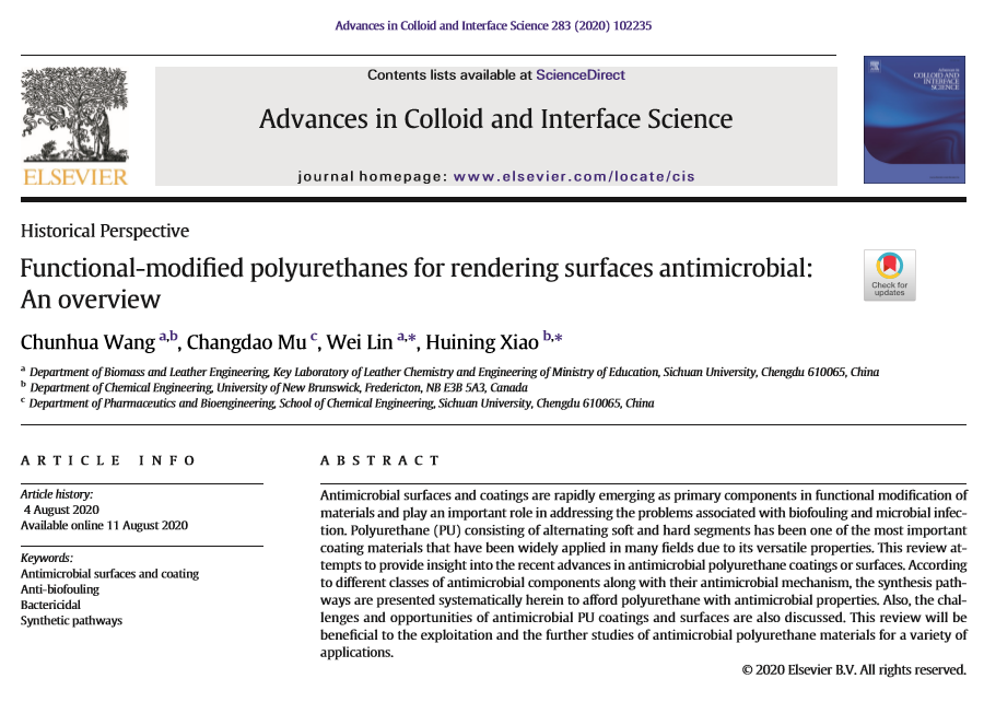 在该综述论文中,也简要介绍了林炜教授课题组近年来针对皮革表面容易“霉变”(生物污损)这一问题,在聚氨酯涂饰材料的抗菌功能化改性制备与合成方面做的系列研究工作,包括发表在Langmuir, Materials Science & Engineering C, RSC Advances, Progress in organic coating, European Polymer Jounal, Journal of Leather Science and Engineering等学术期刊上的相关研究成果。其最为重要的贡献是将相关学科发展的基于 “抗菌吸附思路”来达到表面抗菌目的这一新理念引入到皮革学科,该新思路可有望解决皮革涂饰领域使用传统的杀菌剂存在的耐药性问题和潜在的安全风险问题。而且,该课题组针对这一抗菌吸附思路,设计发展了评价皮革表面的抗霉菌吸附(固-固界面)的方法,此方法可有效检测霉菌在皮革表面的吸附和繁殖过程,这不仅有助于从微观角度上理解皮革及其制品霉变机理,且突破了抗生物污损材料常限于固-液界面研究及应用的局限。