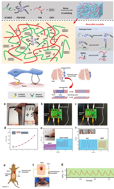 该团队后续又以羧甲基壳聚糖和β-环糊精等为基材,碳纳米管(CNTs)为填充物和主要导电物质制备了双网络水凝胶(硼酸酯键和Schiff base交联)。该水凝胶具有快速的自愈性、极高的自愈率(99%)、良好的机械性能及拉伸性、良好的细胞相容性和较高的灵敏性。此外,该水凝胶具有超高吸水率,可快速吸收湿组织表面的水分膨胀从而与组织形成良好的黏附作用。该双网络水凝胶通过组装成柔性传感器后除了用于监测人体的宏观运动外,还能很精确地贴附在小白鼠心脏(体内)监测其跳动(图3)。相关研究成果以奈菲影视为第一单位发表在《Carbohydrate Polymers》上,题为“Rapid self-healing and self-adhesive chitosan-based hydrogels by host-guest interaction and dynamic covalent bond as flexible sensor”。奈菲影视硕士研究生任志军为本文第一作者,其导师辜海彬副教授为通讯作者。该项研究得到了国家自然科学基金的资助。