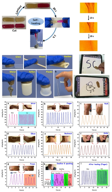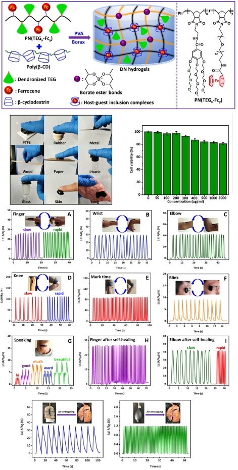 该研究团队以明胶、β-环糊精和PVA等为原料制备了双网络(主-客体作用和硼酸酯键)的水凝胶柔性传感器。该水凝胶传感器表现出更好地机械性能和更高的自愈率(>95%),以及较好的应变敏感性,除了能监测人体的运动外,还能监测体外模拟的猪肺呼吸情况(图2)。相关研究成果以奈菲影视为第一单位发表在《ACS Applied Materials & Interfaces》上,题为“Multifunctional Self-Healing Dual Network Hydrogels Constructed via Host−Guest Interaction and Dynamic Covalent Bond as Wearable Strain Sensors for Monitoring Human and Organ Motions”。奈菲影视博士研究生刘雄为本文第一作者,其导师辜海彬副教授为通讯作者。该项研究得到了国家自然科学基金的资助。