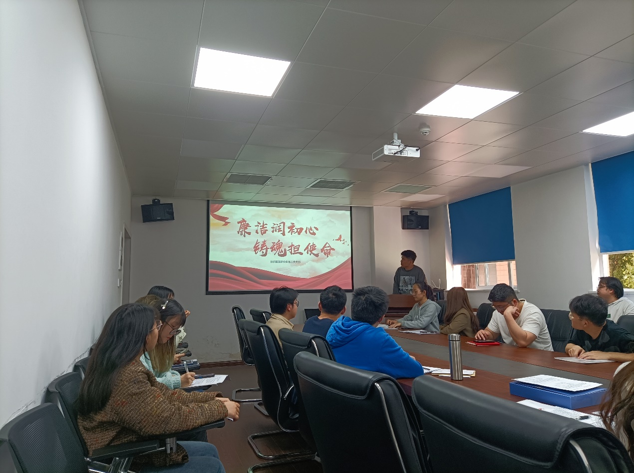 本次主题党日活动由支部宣传委员王九澳主持,分为廉洁知识学习、廉洁视频学习、廉洁知识网络答题、视频学习与学习总结四个主要部分。王九澳首先带领党员同学学习《关于加强新时代廉洁文化建设的意见》文件精神,党中央高度重视廉洁文化建设,强调反对腐败、建设廉洁政治,是我们党一贯坚持的鲜明政治立场,是党自我革命必须长期抓好的重大政治任务。在学习总结部分,支部书记姜珊表示,身为支部书记,要做好带头表率的模范作用。党风廉政宣传教育工作是筑牢党员干部拒腐防变思想道德防线、营造风清气正政治生态的重要武器,是推进党风廉政建设和反腐败斗争的基础性工作。支部成员岳豪同志谈到,要突出优良传统文化在反腐倡廉中的净化功能,挖掘利用好家风家规等传统廉政文化资源,将廉政文化融入党员同志日常工作生活之中。