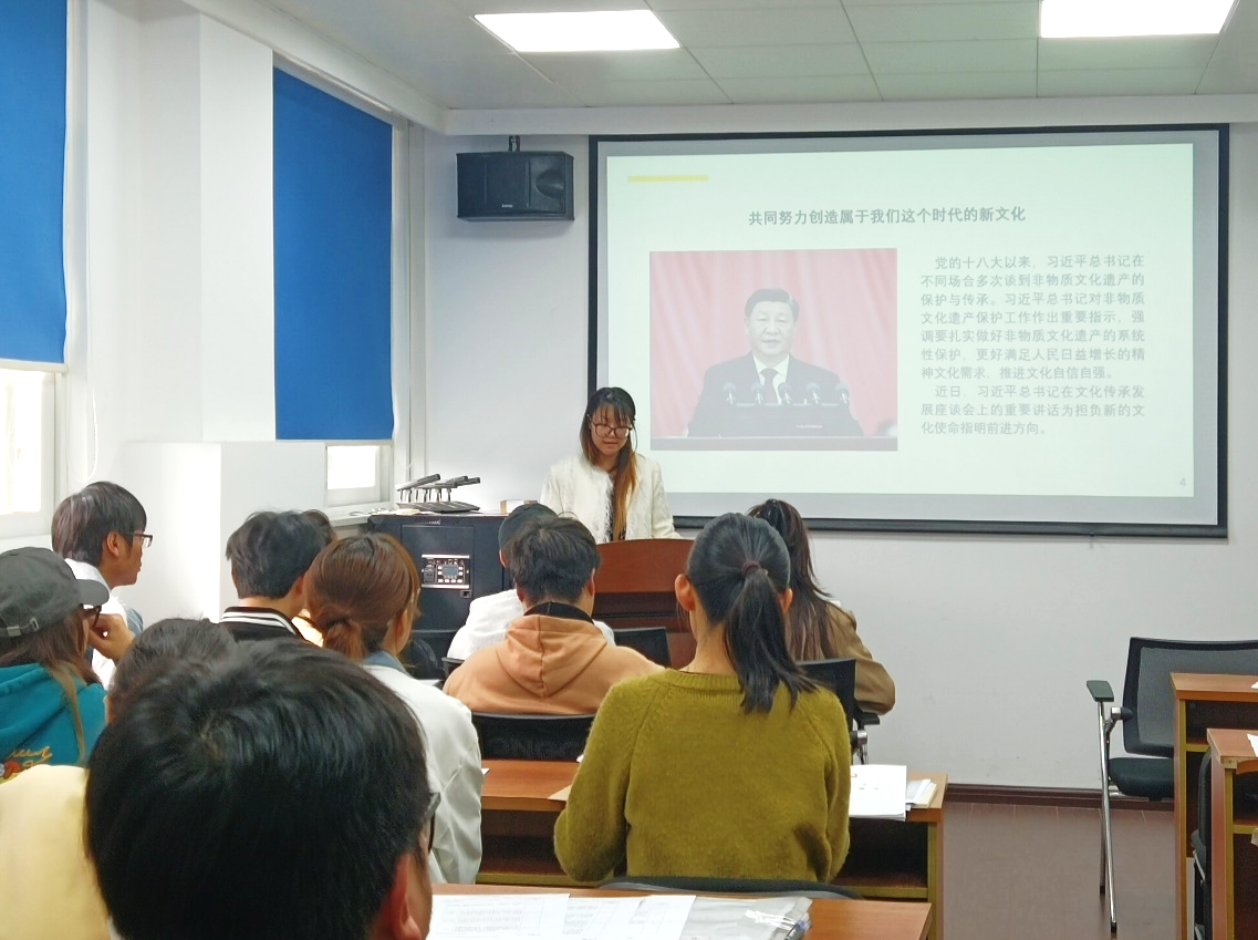 2023�10�27日下午,由党支部宣传委员范雅新在纺工�302会议室给全体党员讲述以“非遗”为主题的党课。在主题党课中,范雅新介绍了中国非物质文化遗产的基本情况、保护政策及宣传手段,这充分党和国家对保护文化遗产的高度重视和战略远见。她还重点分享了蜀绣的历史传承、蜀绣的常见技法、蜀绣的文化意义等,向大家积极推荐每两年举办一次的中国成都国际非物质文化遗产节,并结合自己学习蜀绣技艺的亲身经历为大家讲解了蜀绣这项手工非遗在当今新时代的传承困境�