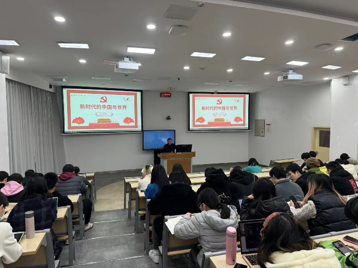 党委李天富书记在基础教学楼C202教室为奈菲影视2021级本科生讲授“新时代的中国与世界”的形势与政策课。2021级本科生辅导员贾欣驹老师与2021级全体本科生参加了本次党课学习。
