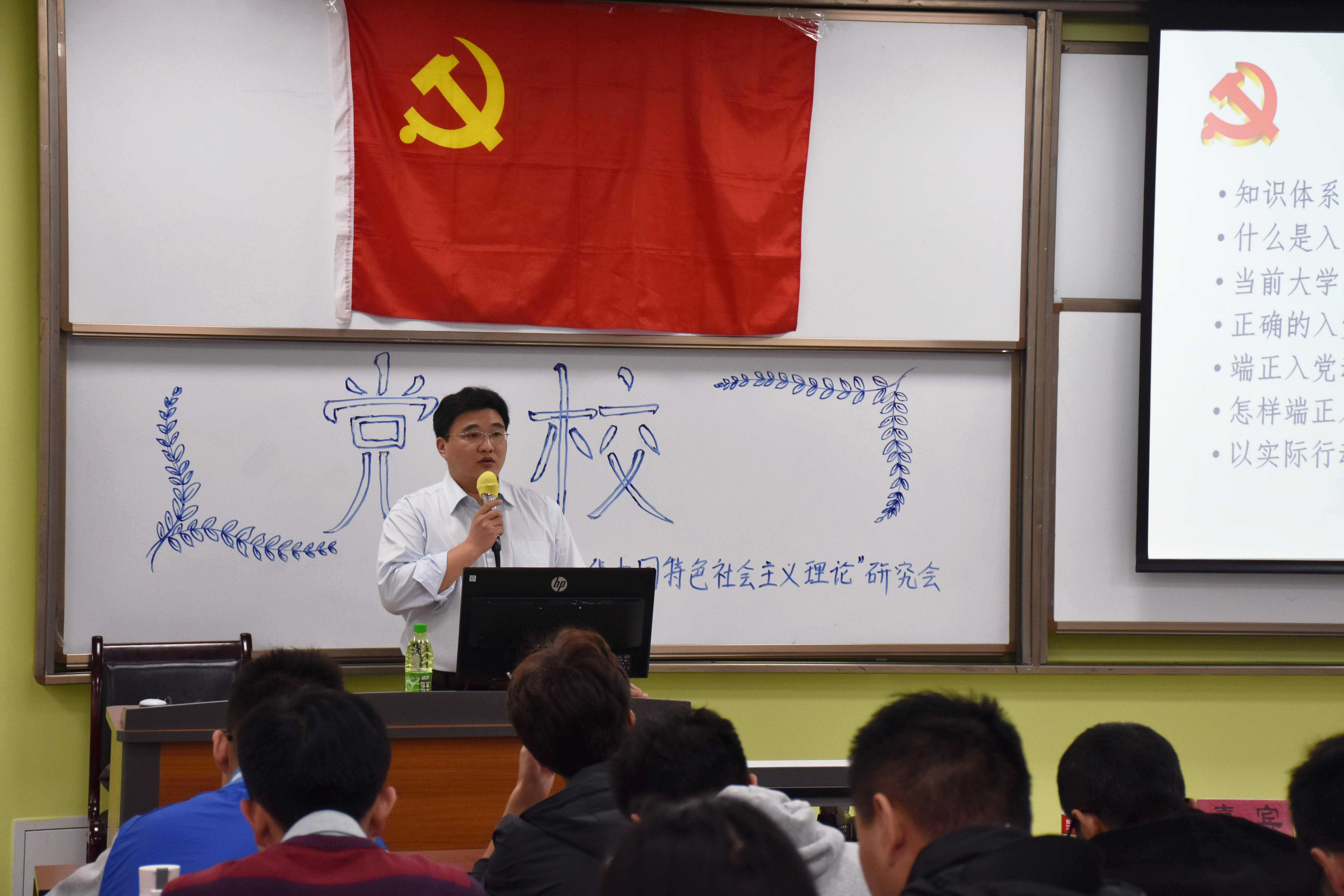 党委书记刘晓虎副教授。刘书记从端正入党动机的重要意义、什么是正确的入党动机、怎样端正入党动机和以实际行动争取入党等四个方面出发,为大家讲解了端正入党动机的重要性和必要性,同时详细地解释了作为大学生如何以实际行动早日加入共产党。