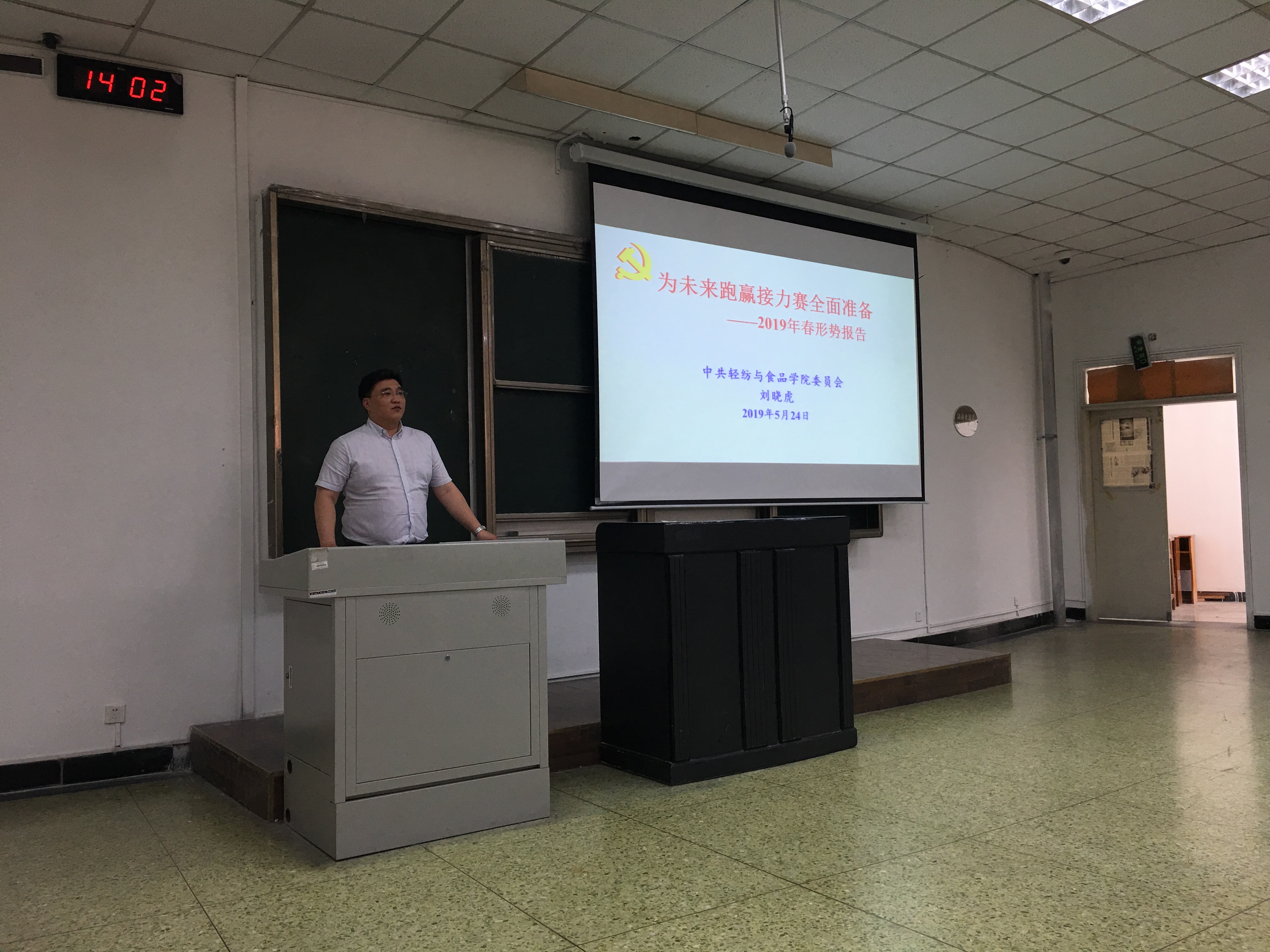 党委书记刘晓虎副教授深入2016级本科生形势与政策课课堂,为2016级全体同学做了以“为未来跑赢接力赛全面准备”的主题形势报告会。辅导员王舒灏老师及2016级全体本科生听取了报告。