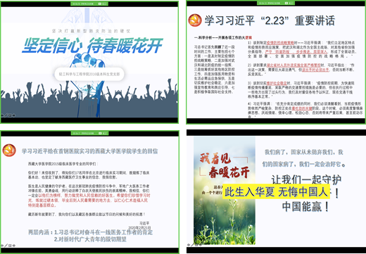 本次组织生活虽是在线上展开,但是支部各位党员同志均克服困难积极参与,踊跃发言,不仅学习了习近平总书记的一系列指导精神,而且还对疫情有了正确全面的认识,推动了基层党组织的凝聚力与战斗力。全体党员同志,表示在全国人民的团结努力下,一定会战胜疫情,我们坚定信心,待春暖花开。