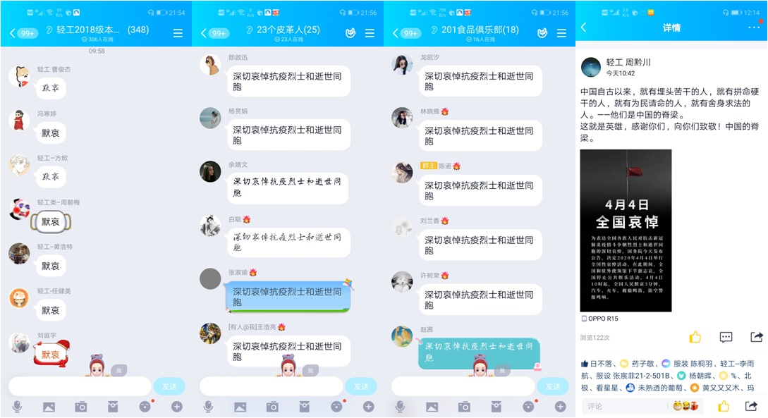 2018级本科生也通过QQ空间、班级群、年级群等载体深切哀悼了牺牲的英烈。