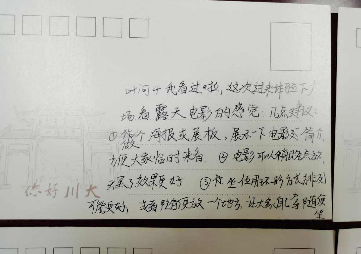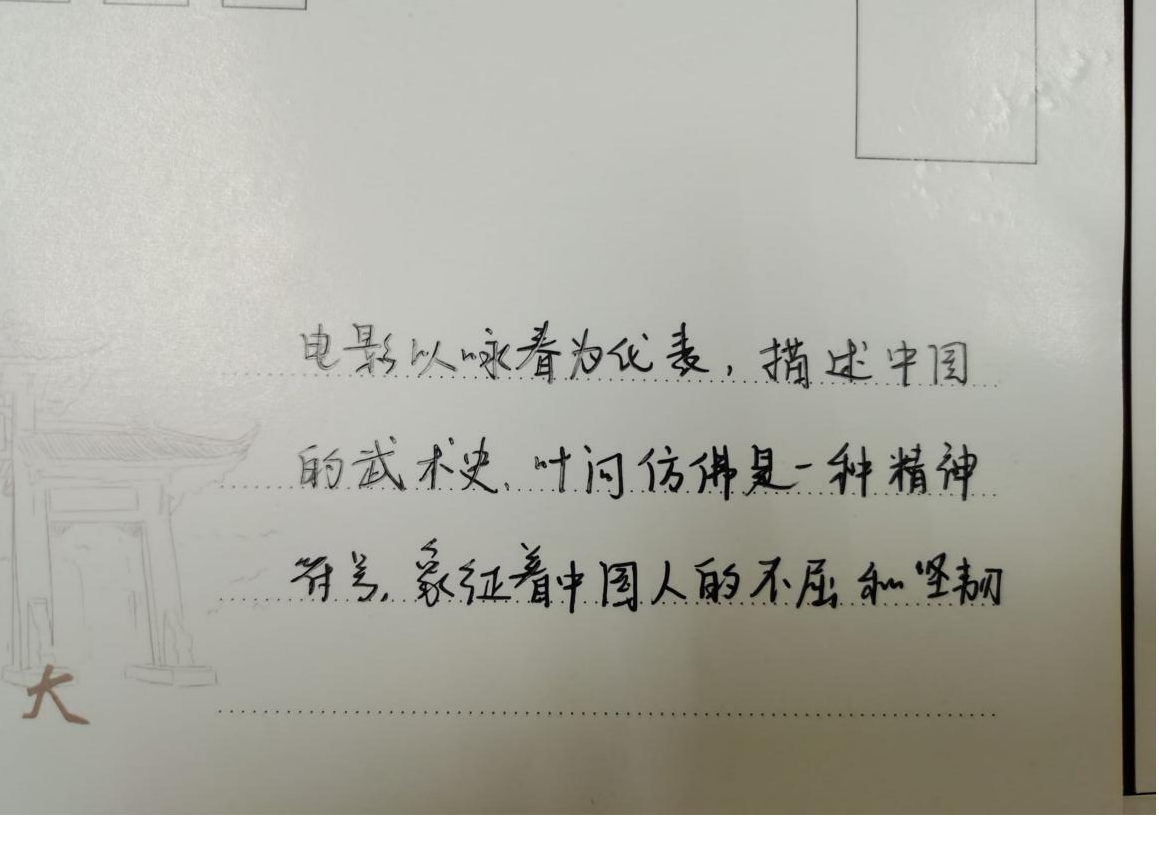 观影过程中,活动负责人向同学们分发明信片,大家纷纷用文字记录下自己的观影体会。同学纷纷表示,中华文化,博大精深;中国功夫,值得传扬;中国人不屈的精神应当被传承。同学们也深深被以叶问为代表的中国人不屈和坚韧精神所感动�