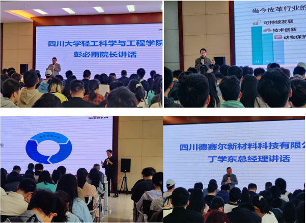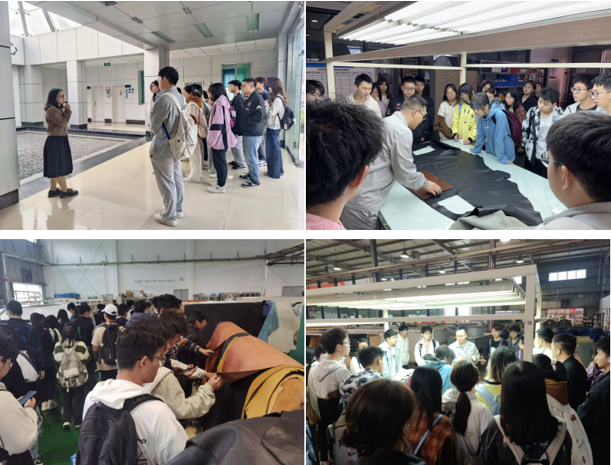 活动第一站来到了四川德赛尔新材料科技有限公司(以下简称德赛尔公司)进行专业认知实习。德赛尔公司成立于1994年,总部位于四川省德阳市,是一家科技型新材料企业。公司集基础研究、应用研究及服务性制造于一体,专注于皮革助剂、加脂剂、复鞣剂、酶制剂及涂饰剂的研发,致力于通过高品质皮革化学品及精准服务方案链接美好生活。在公司讲解员的带领下,同学们依次参观了行政区、技术应用中心、检测中心等多个部门,深入了解了现代制革企业的产品开发设计、生产流程和技术应用创新模式。