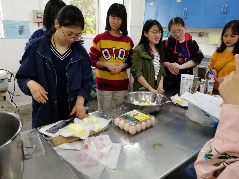 下午14:00,工作人员将所有购置原材料清点分选完毕。待25名参加人员到场签到完毕,随即分为四个小组开始制作。首先由工作人员讲解曲奇制作步骤并分发实验手册,将黄油在室温下进行软化,加入糖粉,用电动搅拌器混合均匀,分次加入蛋液打发,低筋粉、奶粉混合,筛入奶油中。混合均匀即可通过模具挤压制作曲奇,于烤箱内烘烤适当时间即可得到成品。在经历了和面、压制成型和烤制等操作后,曲奇饼干制作完成,造型独特,风味也得到大家一致好评。