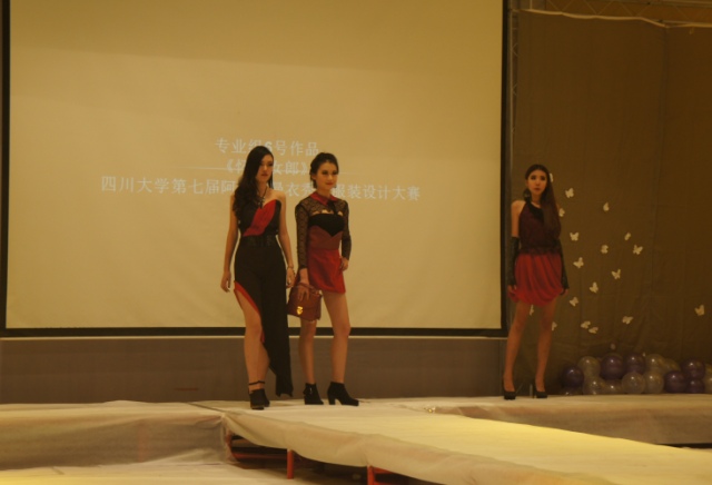 本次大赛共有专业组11组,校服组9组,业余组5组进入决赛,其中专业组和校服组参加了现场展示和评比。随着灯光的明暗变幻,背景音乐响起,一个个模特身着参赛同学的作品自信而洒脱地走上T台,用或优雅或不羁的肢体语言诠释着对服装的理解。一组展示完毕,音乐变更,灯光变幻,下一组模特便闪亮登场。而每一组设计者对音乐的挑选、模特的设计都恰如其分地烘托了服装的设计理念。专业组、校服组展示完毕后,由张皋鹏副教授、吴晶副教授、万宗瑜老师、冯洁老师和周丽芬总经理组成的评委团分别对展示作品的设计创意、面料选择、服装结构、市场前景等方面进行了点评。嘉宾们精彩、务实、诚恳的点评赢得了设计者们和观众们的热烈掌声。决赛历时2小时,通过激烈精彩的角逐,专业组和校服组分别有三组作品脱颖而出,并有两组作品分别获得最受观众欢迎奖。与会嘉宾为获奖选手颁发了荣誉证书并合影留念。