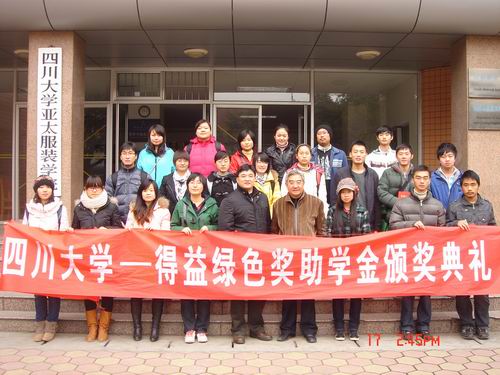 -得益绿色奖助学金颁奖典礼在食品系二楼报告厅隆重举行。参加本次颁奖典礼的有四川得益绿色食品集团有限公司孟副总;轻纺与食品学院党委副书记刘晓虎副教授;2007级辅导员罗魏老师以及2010级辅导员段飞霞老师。颁奖典礼由院分团委副书记冯国涛老师主持。