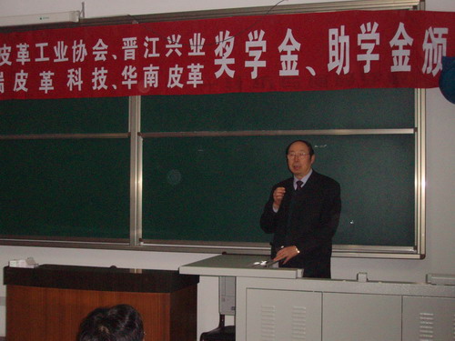 设立奖助学金表示由衷的感谢,对获奖同学表示衷心的祝贺。同时也对所有同学提出殷切的期望,希望同学们再接再厉,争创更加优异的成绩,回馈社会对皮革系的支持与鼓励。徐永会长代表中国皮革工业协会表达了对获得奖学金同学的祝贺,阐述了协会长期以来在我系设立奖学金的宗旨,同时也勉励我系学生勤奋学习,为我国皮革行业的“二次创业”贡献力量。罗丰旭副总裁则代表晋江兴业皮革有限公司简介了公司的情况,也提出了现在皮革行业所面临的各种压力与挑战,尤其是对高素质人才的需求量越来越大,希望我们的学生能够抓住机遇,努力学好专业知识,在以后的工作中展示自己的才华。随后各位嘉宾及与会领导为获奖同学颁发了荣誉证书,最后来自2006级轻化工程专业的获奖同学代表王玄进行了发言,她首先对获奖单位的支持与鼓励表示真诚的谢意,同时也表示在今后的学习生活中,一定以此为新的起点,更加勤奋努力,不辜负社会各界及学院领导的殷切期望,用自己的实际行动来回报社会。