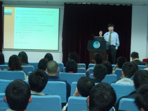 首先,马崧博士作了KEEP UP WITH THE CHANGES OF WORLD LEATHER INDUSTRY主题报告。他不仅讲到了如何跟上世界皮革工业的发展步伐,更用幽默、风趣的语言提出了如何在日益变化的社会竞争中抓住机遇和迎接挑战。让我们同学要有充分的准备,变化对我们来说是巨大的机遇、尤其是对年轻人来讲更是如此。但也需要我们要有扎实的专业知识和敏锐的洞察力。报告会结束以后,马崧博士及马军龙先生就皮革行业的发展形势、对人才培养的要求以及对人才的需求等同学们非常关心的问题进行了详细的交流,同学们提问积极踊跃,现场气氛十分活跃。