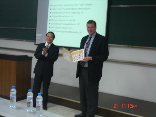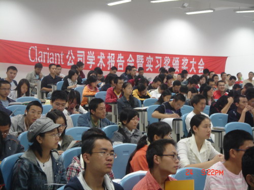 皮革系杰出校友马军龙先生以及Clariant公司广州分公司GTC行政经理李艳女士一行四人访问我校。并于25日上午9:30—11:30在综合楼C207隆重举行学术报告会暨实习奖颁奖典礼。轻纺与食品学院副院长何有节教授、党委副书记刘晓虎老师、冯国涛老师、李晓秀老师、段飞霞老师、罗魏老师以及2007级新生、2004级获奖同学等300人出席了报告会。报告会由刘晓虎老师主持。