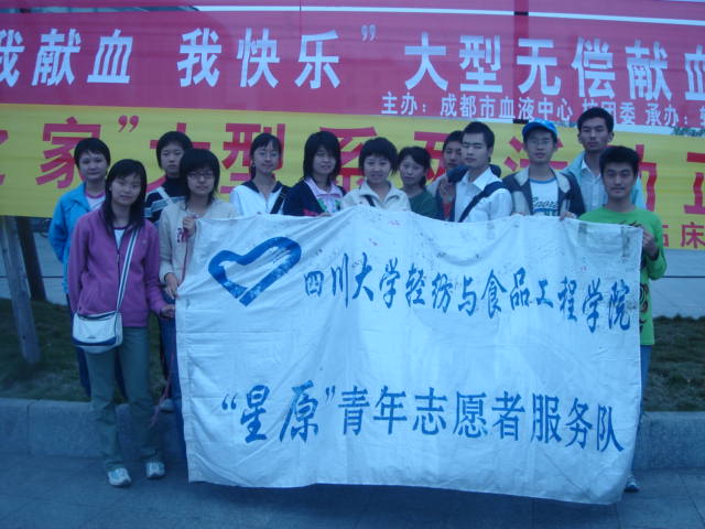 06级新干事大多是第一次参与本队的大型活动,个个摩拳擦掌,积极性很高.活动从上午9点起至下午2点结束,但从七点半大家就开始着手布置现场.9点整,成都市血液中心的采血车准时到达青春广场,进行采血.青春广场上一个个青春,忙碌的背影立刻活跃起来,协助医务人员采血,登记,照料献血人员,发放宣传资料……大家热情高涨,时刻紧守自己的服务岗位,细心为献血者讲解献血流程和注意事项,本次活动就这样井然有序的开展着……中午11点起由第二班人员交接工作,他们负责11:30到14:00的活动。