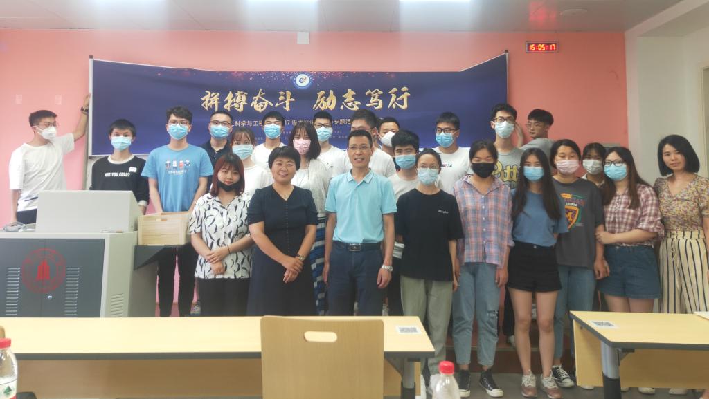 2017级本科生党支部书记暨2018级辅导员杨维老师、熊永铭及腾汶玲等两位考研成绩优异的学长代表。本次活动由2017级本科生党支部望江校区党小组组长杨恒同学主持,2017级已返校的20余名学生现场参会,其余学生线上参与。
