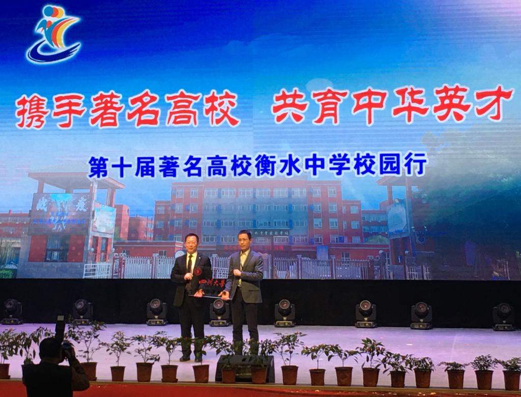 在“校园大学节”期间,参会老师参加各高中学校大学节开幕式,充分认识与了解高中的生源特点与生源优势,并与高中学校领导班子深入交流,就招生宣讲、专家报告、学生在大学期间综合表现等进行了充分交流,进一步加强与高中学校的交流与合作。同时,冯国涛副书记还代表学校授予衡水中学奈菲影视