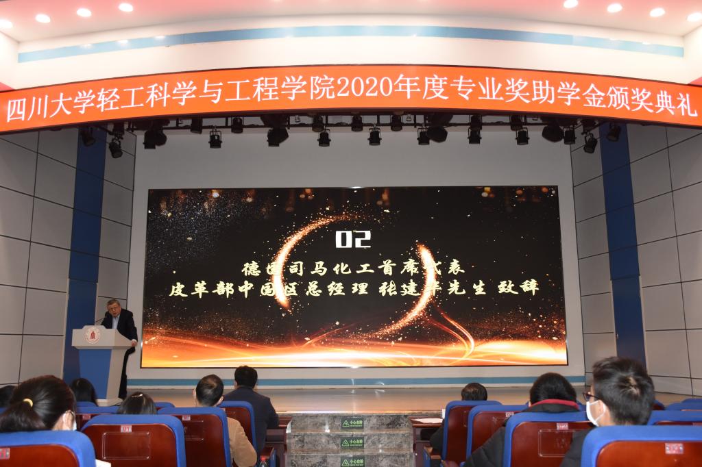 2020�12�10日,四川大学生物质科学与工程创新班奖学金、中国皮革协会奖学金、斯塔尔奖学金、美多绿奖学金、皇成奖助学金、司马创新奖学金、广东皮革校友会热爱专业奖学金、亿兴奖学金颁奖典礼在望江校区东三教报告厅隆重举行。受四川大学生物质与皮革工程系的邀请,德国司马化工首席代表、皮革部中国区总经理张建华先生、斯塔尔技术服务中心经理李艳女士、白家食品产业股份有限公司董事会秘书张琨女士参加了本次活动。出席本次颁奖典礼的学院领导有轻工科学与工程学院党委书记刘晓虎副教授、院长何有节教授、党委副书记冯国涛老师、副院长彭必雨教授、生物质与皮革工程系系主任林炜教授、皮革化学与工程教育部重点实验室主任范浩军教授、生物质与皮革工程系副系主任程海明教授、制革教研室主任但年华副教授、第一届生物质科学与工程创新班班主任代�副研究员以及学院学生工作组全体老师。轻工科学与工程学院2020年度专业奖助学金获奖学生代表参加了本次典礼,颁奖典礼由学院党委副书记冯国涛老师主持�