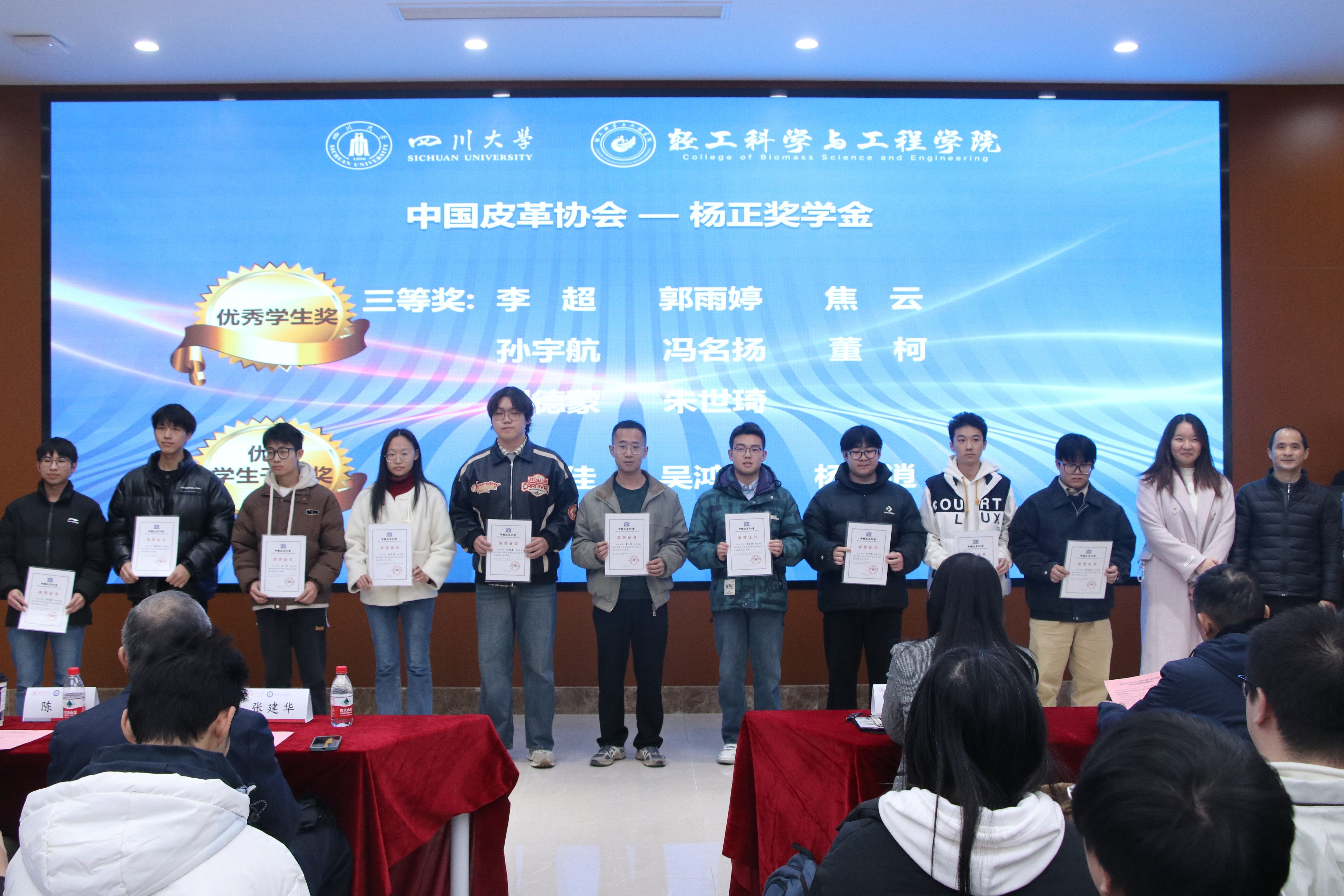 2024�12�13日下午,四川大学生物质与皮革工程�2024年专业奖助学金颁奖典礼在皮革楼互联网中心隆重举行。出席本次颁奖典礼的领导与嘉宾有中国皮革协会秘书长张燕女士,德国司马化学有限公司皮革部中国区总经理张建华先生,斯塔尔精细涂料有限公司-斯塔尔学院中国区经理夏敏先生,斯塔尔精细涂料有限公司-斯塔尔中国区皮革部业务经理康海生先生,轻工科学与工程学院李天富书记、副院长陈意教授,生物质与皮革工程系副系主任程海明教授、副系主任吴重德教授。颁奖典礼由学院党委副书记冯国涛副教授主持�