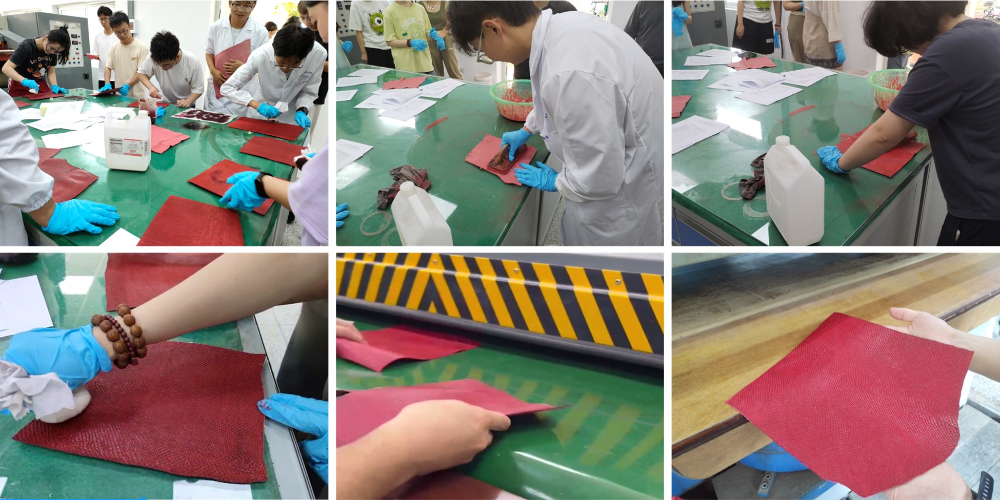 社团成员开展了如下实践:(1)手工刷油蜡底涂层;(2)压花鱼皮纹;(3)手工套色,形成双色效应;(4)喷涂面浆层(中涂层);(5)喷涂光亮手感层(顶涂层)。活动过程中,每位成员都亲自实操,感受涂饰过程中真皮的触觉变化,掌握涂饰操作要点。