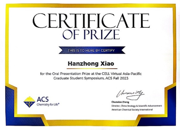 向均副研究员受美国化学会邀请,担任首届纤维素和可再生材料亚太学生分会场主席。该分会场特别邀请了来自亚太地区纤维素和可再生材料顶级课题组的学生作为报告人。评委根据报告内容的具体性、报告呈现效果、口语表达能力以及问答表现,从30位英文报告人中评出6位优秀报告奖得主,并向他们颁发了口头报告证书以及ACS特制纪念品。
