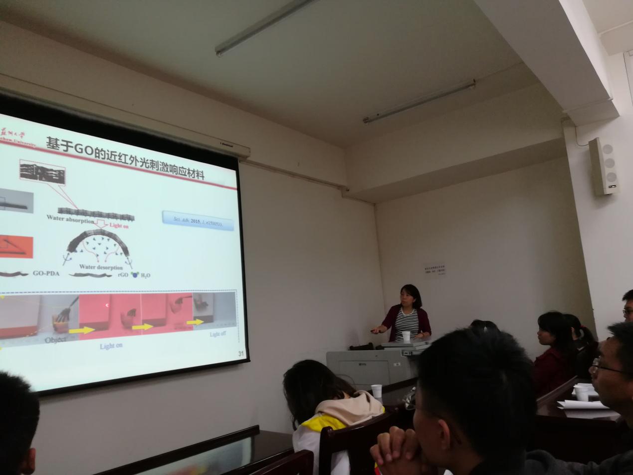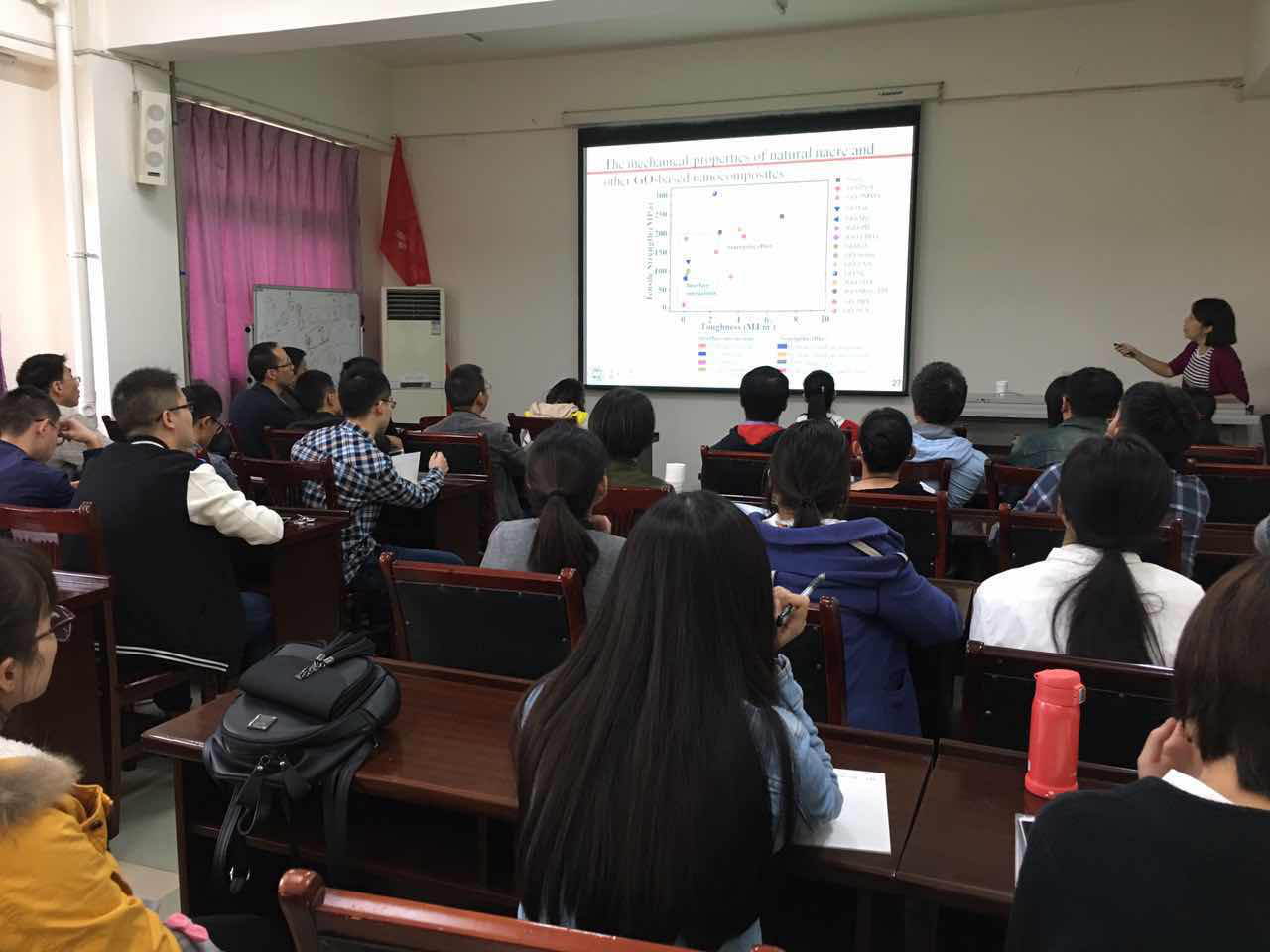 ,在南京大学获高分子化学与物理博士学位,并先后在香港理工大学和宾夕法尼亚大学从事博士后研究和担任访问学者,她的研究兴趣在于石墨烯/高分子功能材料和具有微/纳结构的导电高分子等领域。杨晓明副教授从石墨烯的历史、石墨烯复合物结构的设计及应用等方面开展讲座,报告了她在氧化石墨烯/聚合物层状结构材料的设计、制备及其近红外光响应研究的最新研究结果。杨晓明老师的报告幽默风趣,内容深入浅出,激起了在座老师和学生的浓厚兴趣。讲座期间,师生踊跃发言提问,通过与杨晓明老师面对面的交流,拓宽了奈菲影视