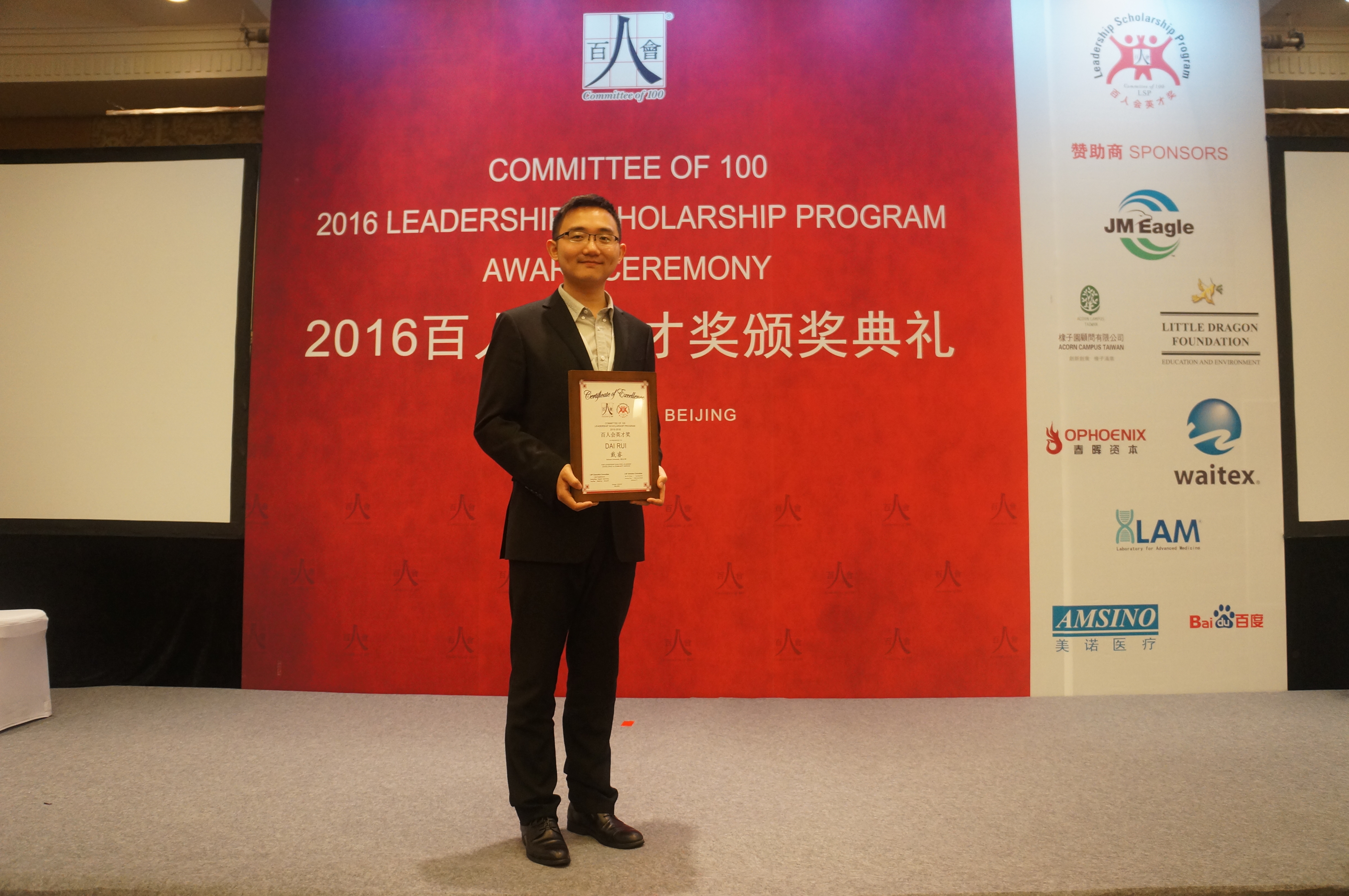 2013级博士研究生戴睿荣膺该奖。百人会会长吴华扬、百人会大中华区联席主席汪大总、百人会英才奖执行委员会主席曾宪章等出席了颁奖活动。