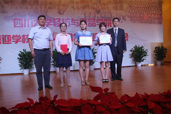 有更大的发展。纺织之光2015年度奖教金获得者郭荣辉副教授和2013级食品科学与工程专业免试研究生薛凡同学分别作为教师和学生代表发言,她们在发言中表达了对母校感恩之心、培育之情,并分享了她们在川大求学、工作、成长、进步的心路历程。