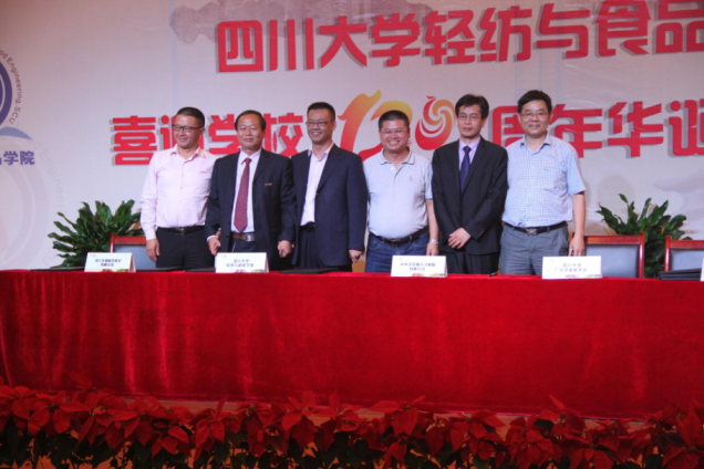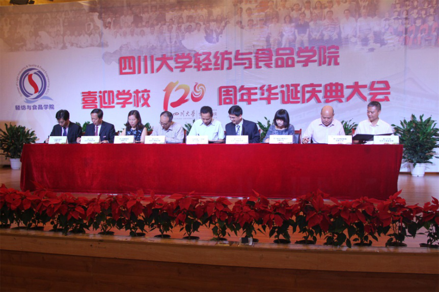 轻纺与食品学院长期以来和企业建立起了非常良好的产学研合作关系,十二五期间,学院的科研经费已接近2个亿。企业家们带着对川大建校120周年的祝福,来到学院的庆典活动现场,与学院签订新的校企合作协议。兴业科技股份有限公司副总经理刘博文先生,江苏鑫博高分子材料股份有限公司总经理沈鑫先生,四川恒星食品有限公司董事长谭兴惠先生,四川省宫玉服饰设计有限公司董事长、首席设计师李文琴女士,四川助康新材料有限公司经理唐勇先生分别与轻纺与食品学院院长何有节教授,副院长兰建武教授,副院长何强教授,纺研所所长朱谱新教授完成了签字仪式。