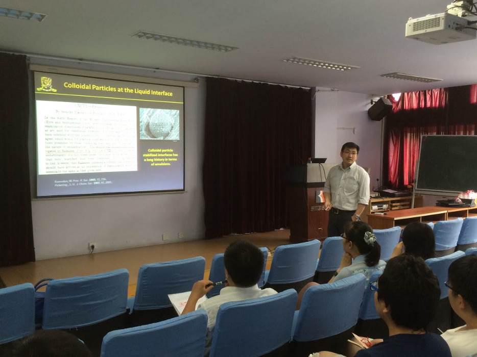 师生作了一场题为“Liquid Marbles: Properties and Applications”的学术报告。报告会由轻纺与食品学院院长何有节教授致欢迎辞,生物质与皮革工程系副系主任林炜教授主持。魏涛教授在报告中对Liquid Marbles的制备原理与方法、独特性质及其作为微型反应器在不同领域的用途等方面的研究工作及最新进展做了详细的介绍。魏涛教授的报告紧抓国际学术前沿研究,内容新颖,讲解深入浅出、思路清晰,激起了聆听报告师生的浓厚兴趣。报告结束后,魏涛教授与学院部分师生进行了交流和讨论。魏涛教授于2003年获香港中文大学化学系化学博士学位,2003年-2005年在德国巴斯夫公司任职,2005年7-12月在美国明尼苏达大学做博士后研究,2006年1月起在香港中文大学化学系任教。目前主要研究领域包括:高分子、胶体粒子和软物质的设计和合成及其相互作用研究等。魏涛教授近年在Angewandte Chemie International Edition、Chemical Communications、Macromolecules、Soft Matter和Langmuir等国际核心学术刊物发表论文80余篇。