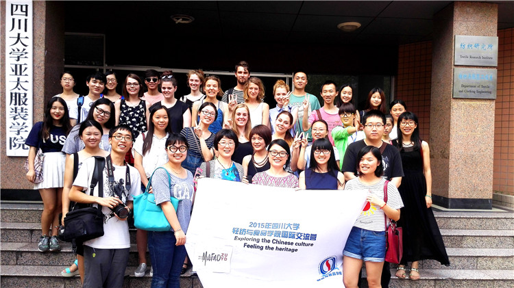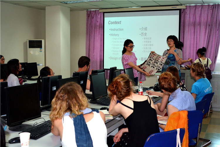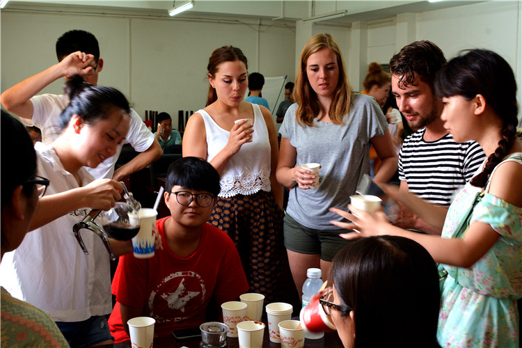 07级服装专业的贺晚非同学担任翻译,贺晚非在本科阶段参加了我校的大学生创新创业项目,她研究的题目就与蜀锦有关,蜀锦相关的众多专业词汇完全难不倒她。来自东华大学的一支蜀锦调研小组也参加了学习,整个教室座无虚席,虽然天气很热,空调也不给力,但是同学们认真地听讲并记笔记,课间同学们还交流了学习心得。下午是蜀锦的设计及电脑编程环节,赵老师颇为赞许荷兰同学们的创意及绘画功底,短短的一节课的时间,同学们设计了各种各样的纹样。赵老师挑了一幅由德国籍服装设计专业的Johanna绘制的,9位留学生的画像作为编程讲解范例,对蜀锦的织造进行电脑编程。由于时间的关系,这次学习只能点到为止,后续的蜀锦织造只能由老师代为完成,作品也要等工厂排期织好后寄送给留学生们,多少给此次交流留下了一点遗憾。课间休息时,留学生们到了2楼的食品专业教室,食品专业的同学们刚在汪凯老师的带领下学会了用手冲、法压和虹吸壶煮咖啡的几种方法,食品系不愧是出学霸的专业,他们活学活用,马上给留学生们展示了学习成果,还手把手教会留学生们操作。这是留学生们来到中国第一次喝到香浓的咖啡,让他们颇感欣喜。