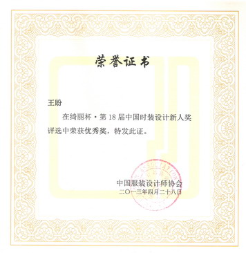 12级服装设计与工程专业研究生王盼在这次比赛中荣获第18届“绮丽杯”新人奖优秀奖。指导老师吴晶、李晓蓉。